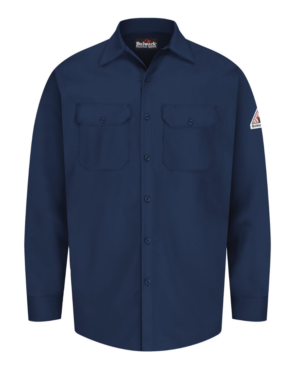 - Two chest pockets with button flap closures and sewn-in pencil stall
